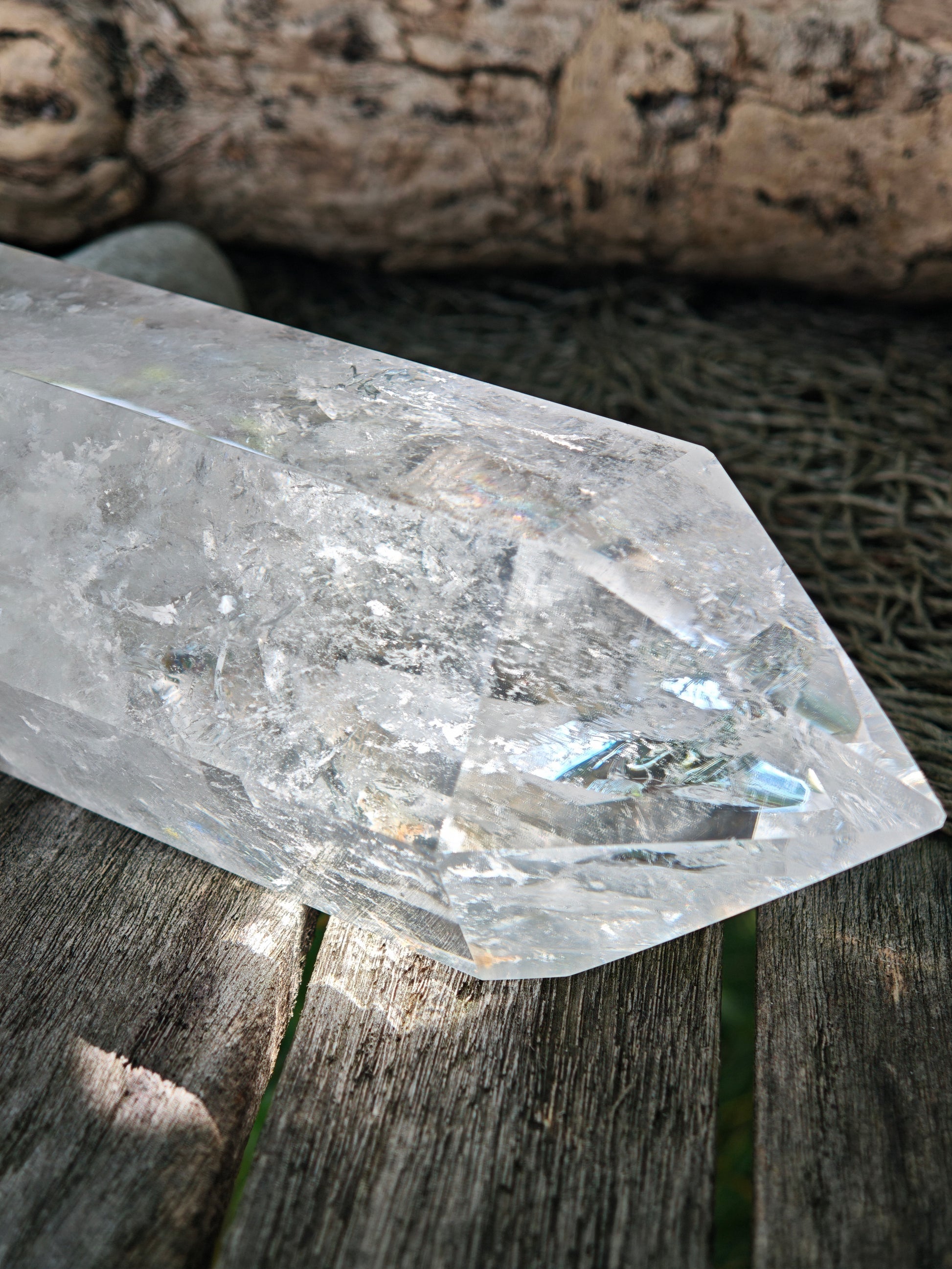 Im Inneren schimmern feine Einschlüsse wie kleine Lichtlandschaften, während die obere Zone fast glasklar wirkt – ein wunderschöner Kontrast, der die Tiefe und Reinheit dieses Steins unterstreicht. Als "Master Healer Stein" steht der Bergkristall für Klarheit, Reinigung und Energiefluss. Er soll helfen, Gedanken zu ordnen, Energien zu bündeln und Räume zu harmonisieren.