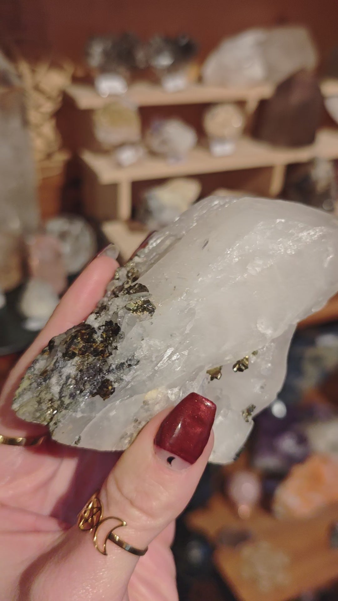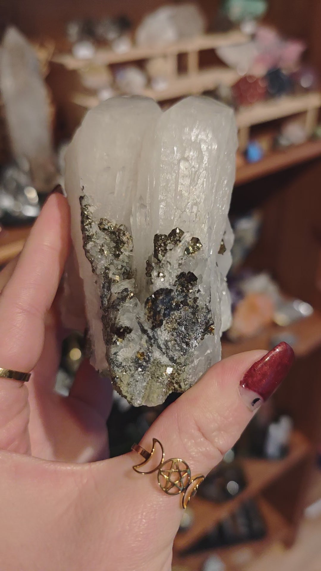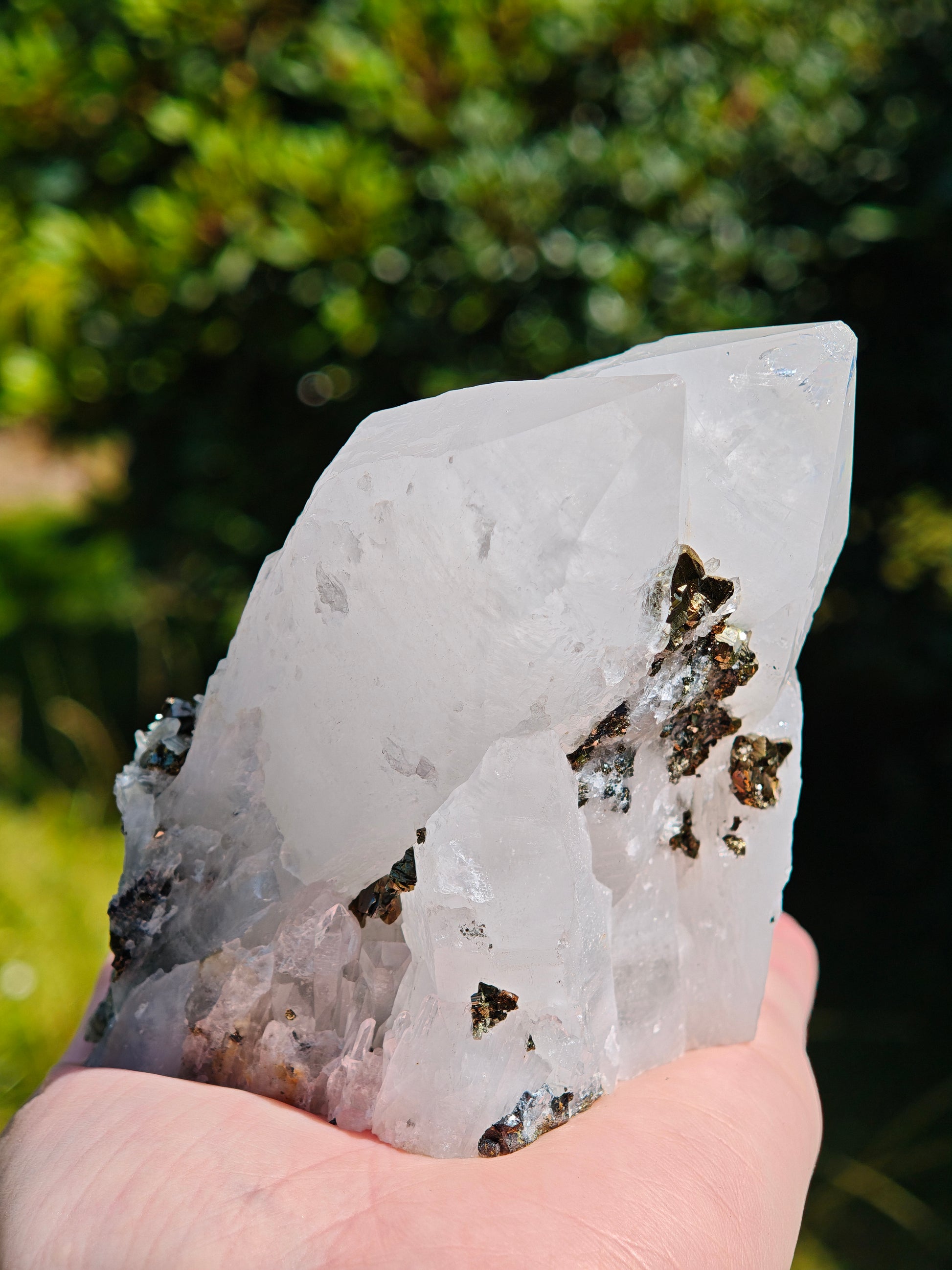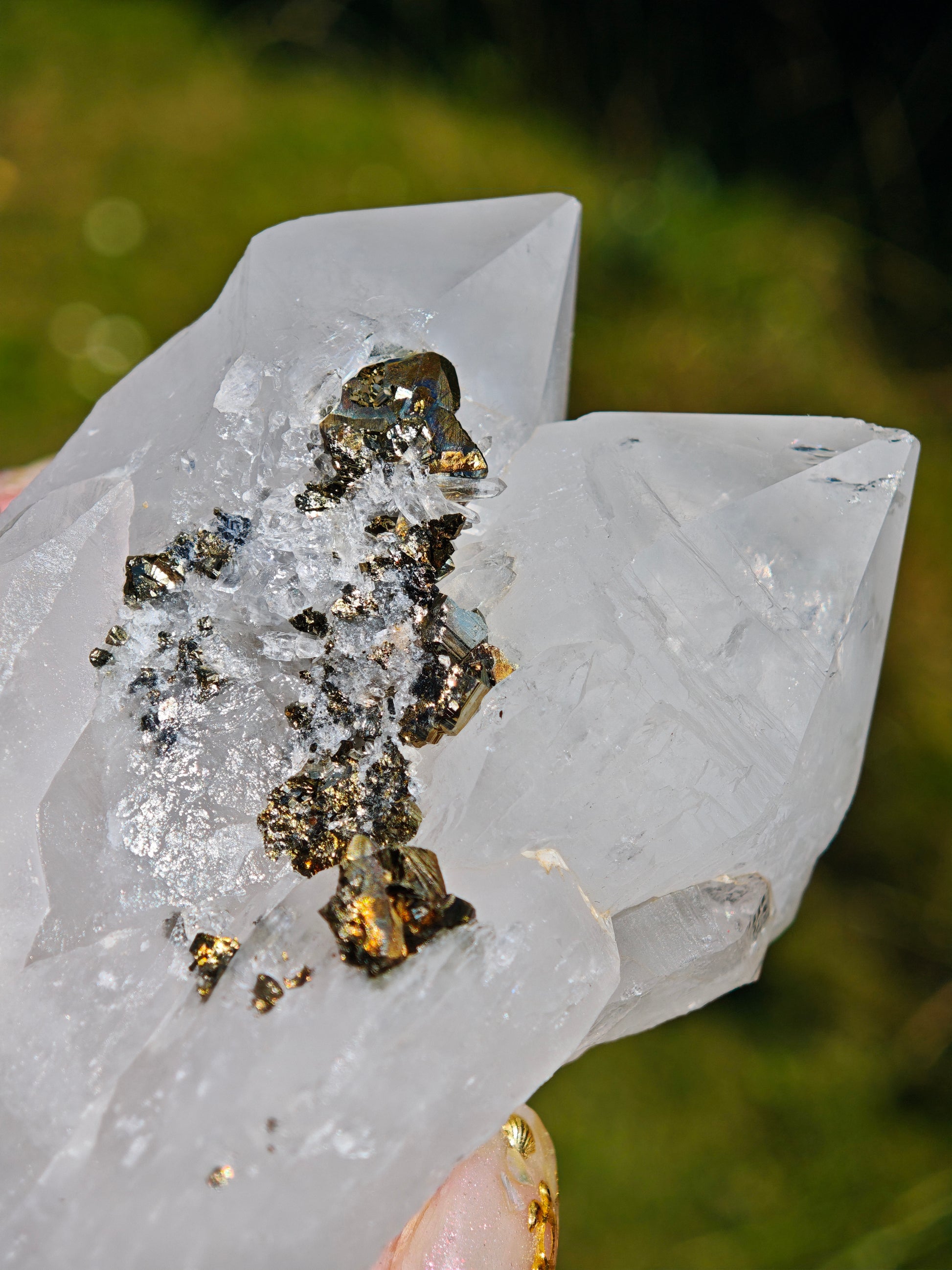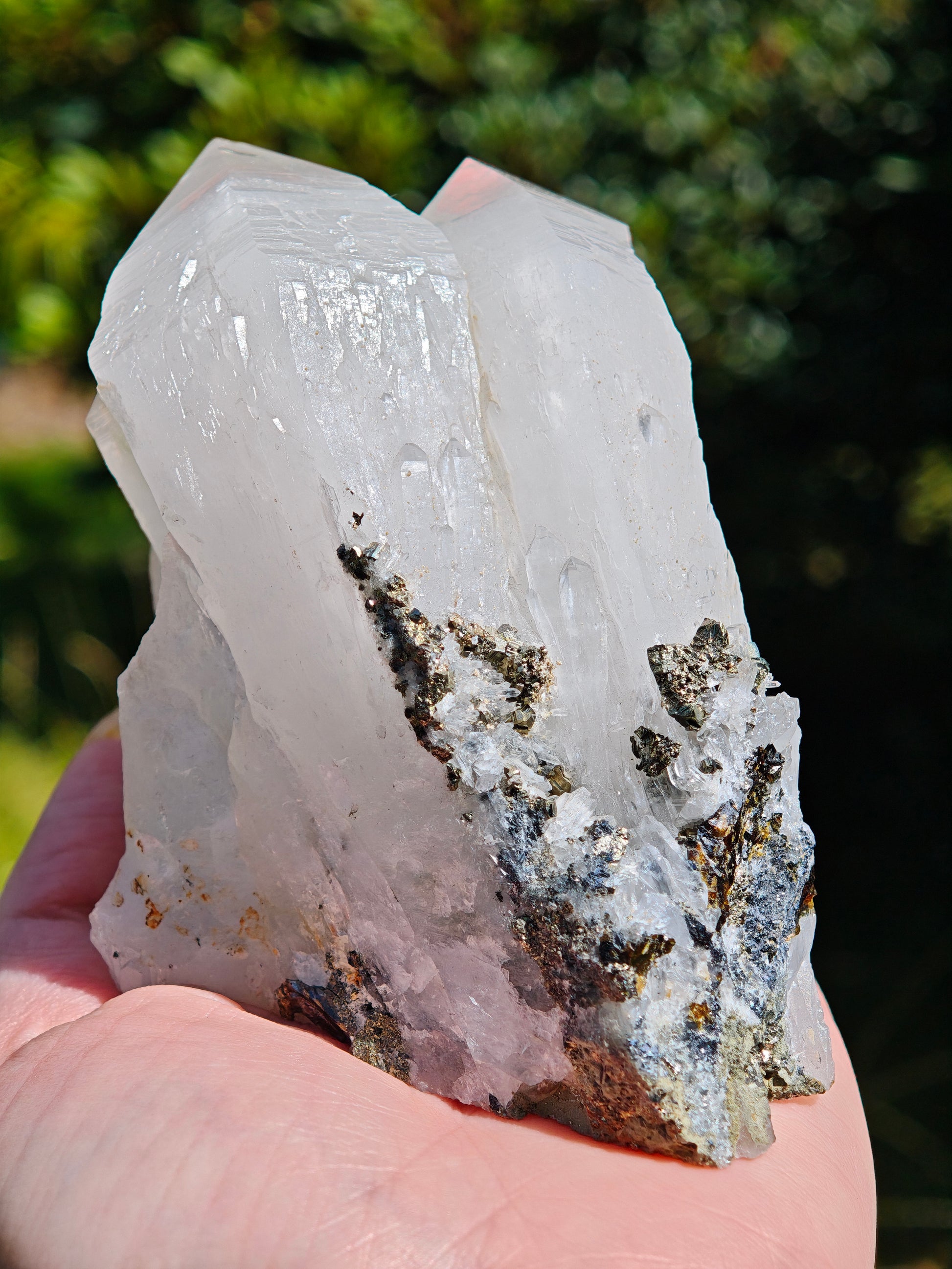 Ein außergewöhnliches Stück Natur, roh, kraftvoll und voller Erdenergie. Diese natürliche Bergkristall-Doppelspitze zeigt an ihrer Oberfläche eine faszinierende Verwachsung aus Pyrit, Hämatit und Chalcopyrit – ein metallisches Mosaik aus Gold-, Silber- und Bronzetönen, das an alte Alchemie erinnert.