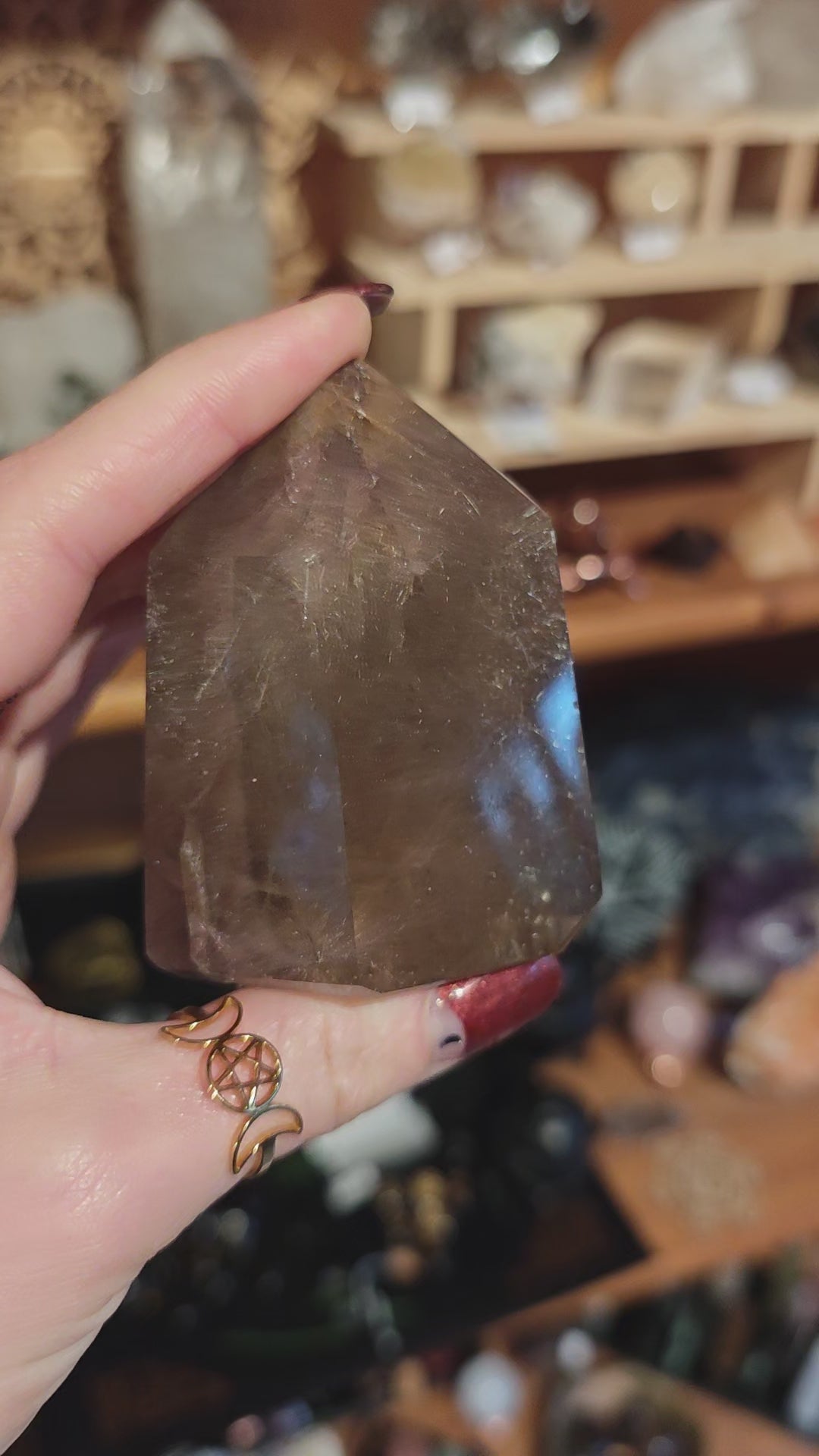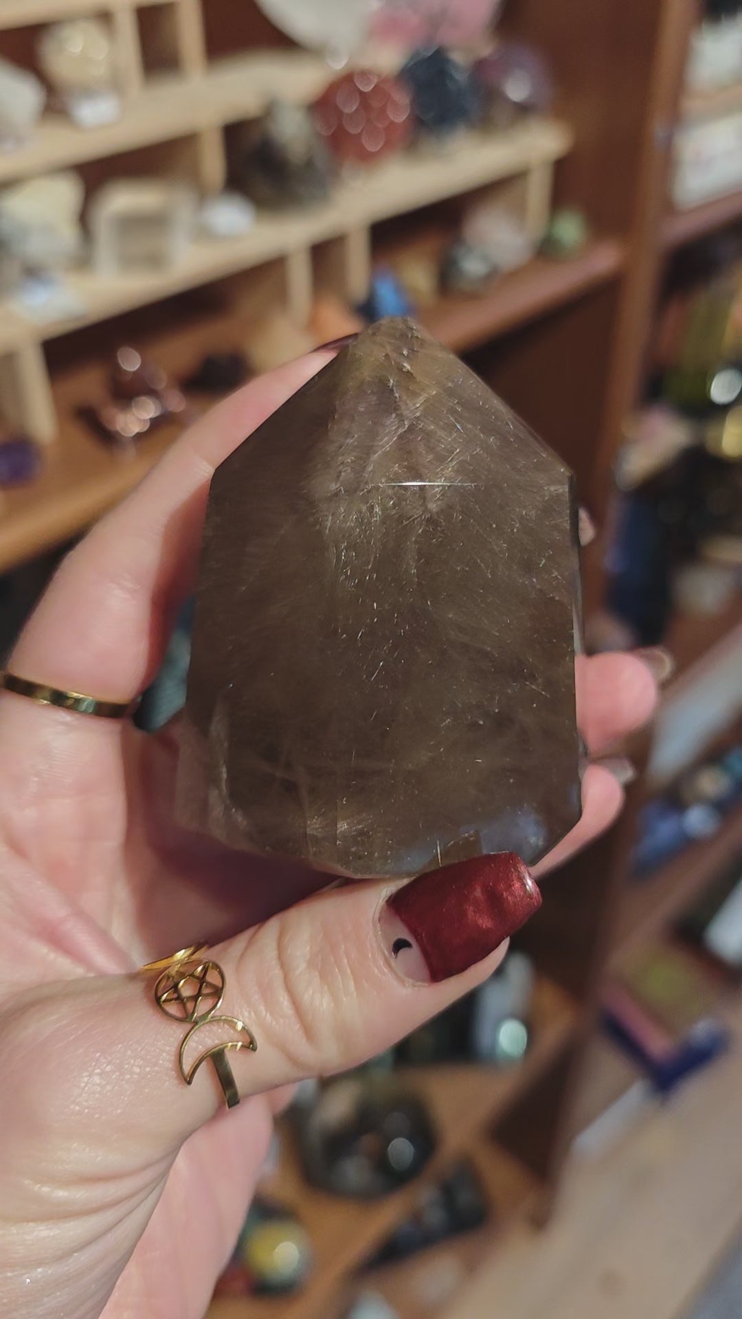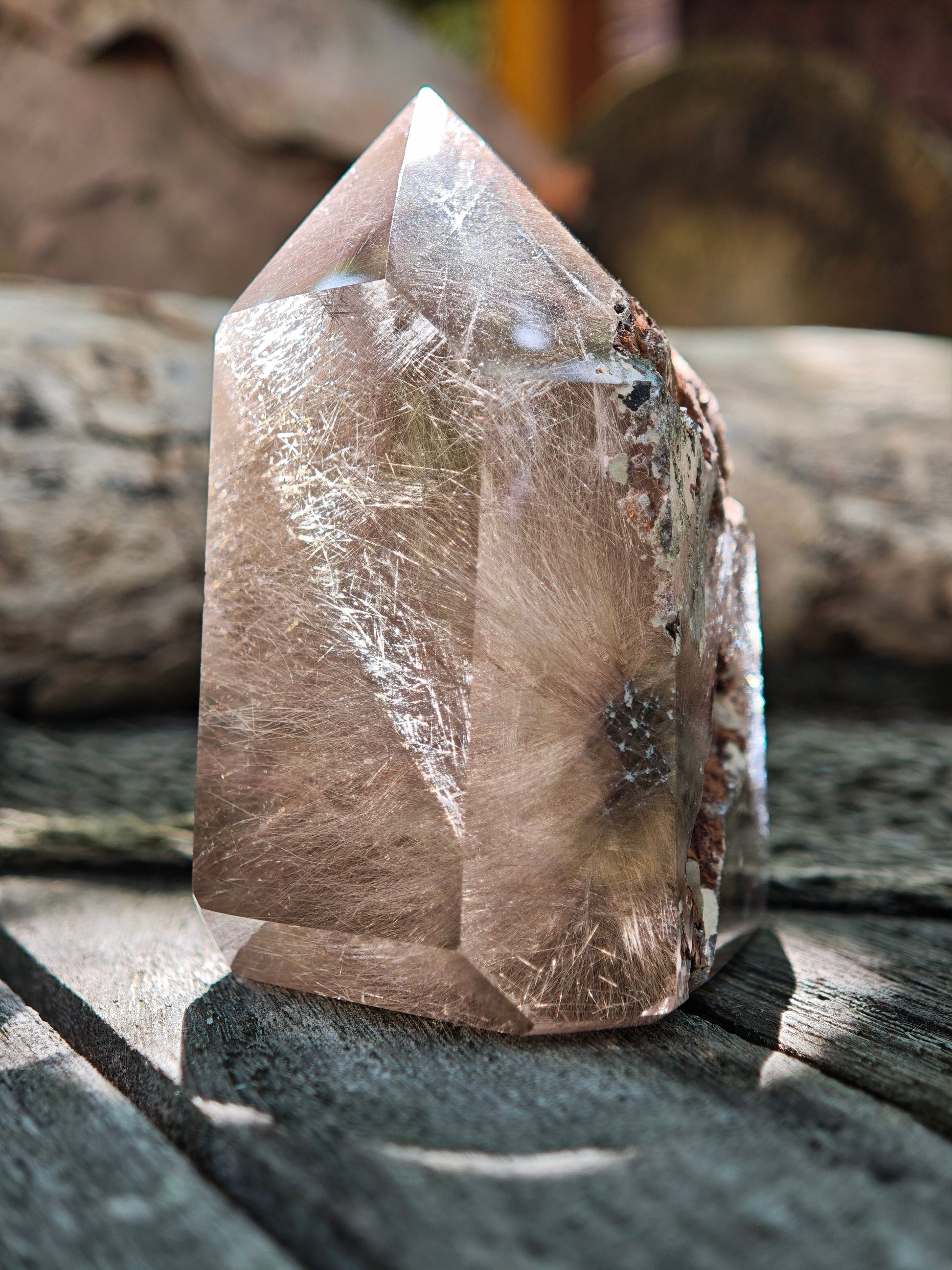 Dieser Rutilquarz ist ein echtes Statement-Stück. Feine, goldene bis bronzefarbene Nadeln durchziehen den Stein wie Sonnenstrahlen, die in festem Kristall eingefangen wurden. Die polierte Spitze bringt diese Lichtfäden zum Leuchten, während die unbehandelte Rückseite an seine natürliche Herkunft erinnert – ein wunderschöner Kontrast zwischen Perfektion und Ursprünglichkeit.