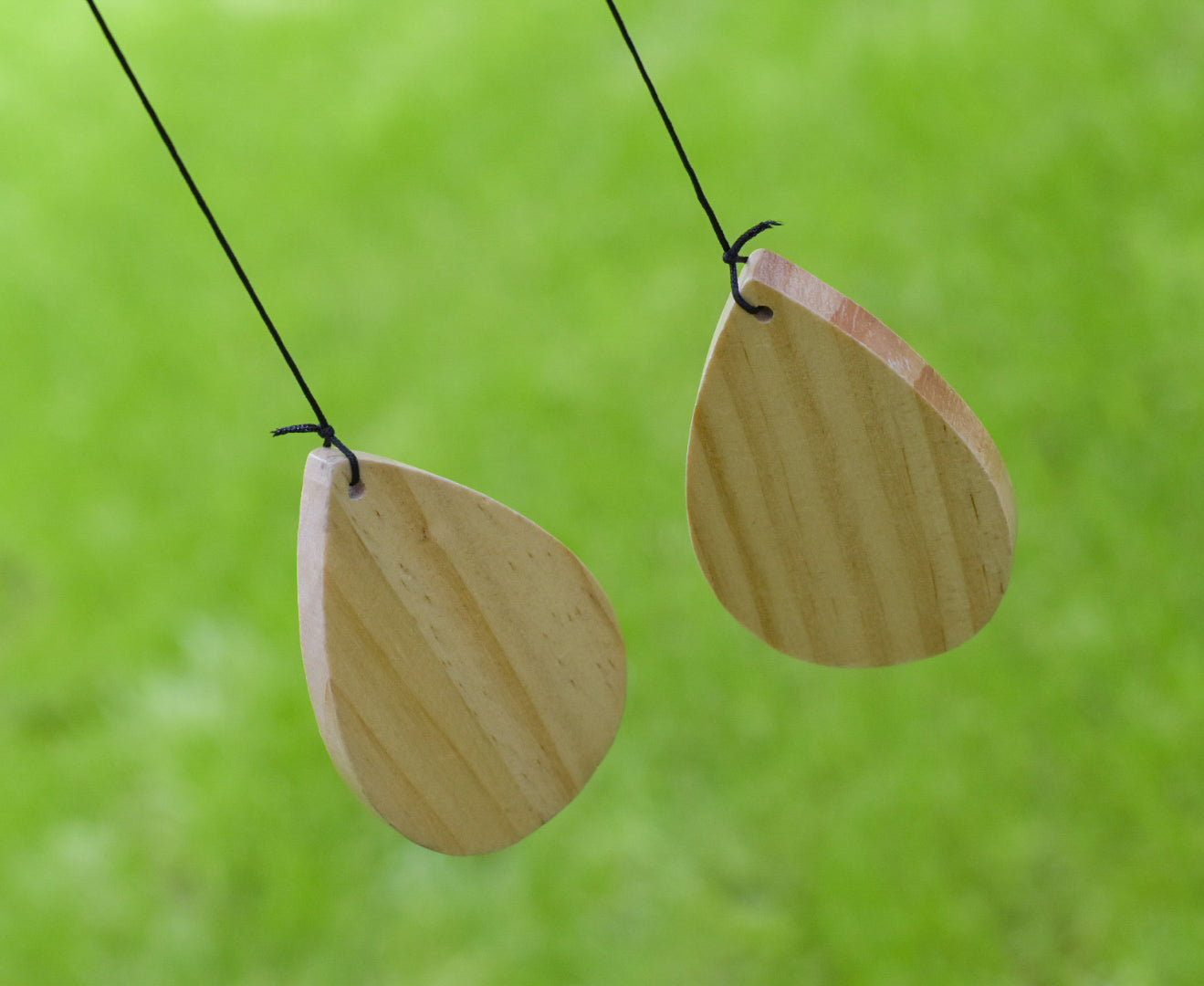 Das Windspiel hat fünf Metallstäbe und zwei Holzklöppel.